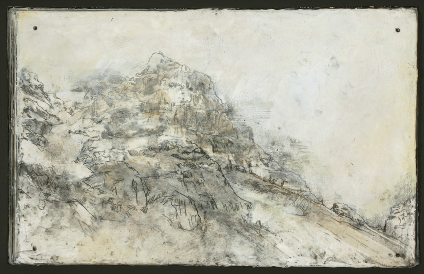 L’écorce du temps (Ehon), 2012 Encaustique, fusain et clous antiques sur livre monté sur panneau 14.25” x 22.75” / 36 x 58cm