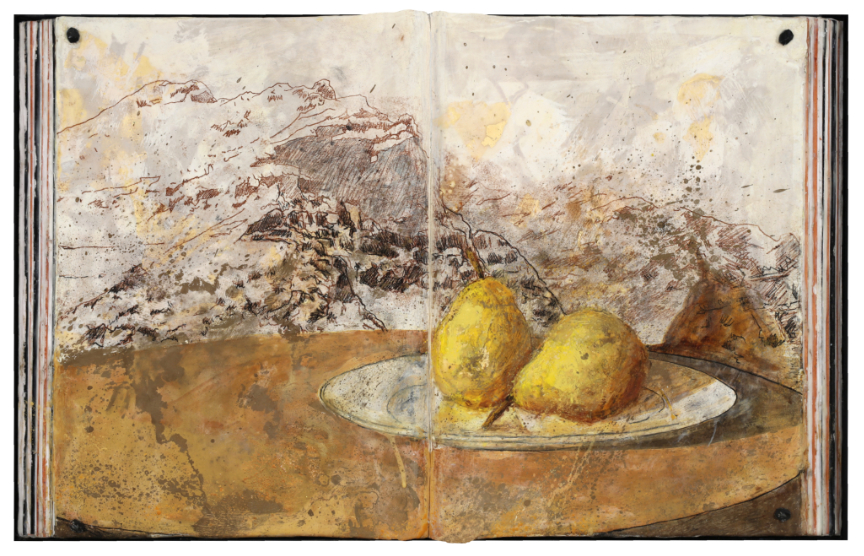 La première lumière (Ehon), 2018 Encaustique, feuille d’or et clous antiques sur livre monté sur panneau 14.25” x 22.75” / 36 x 58 cm