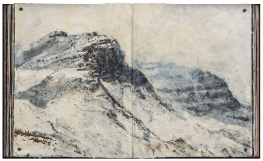 Encaustique, fusain et clous antiques sur livre monté sur panneau