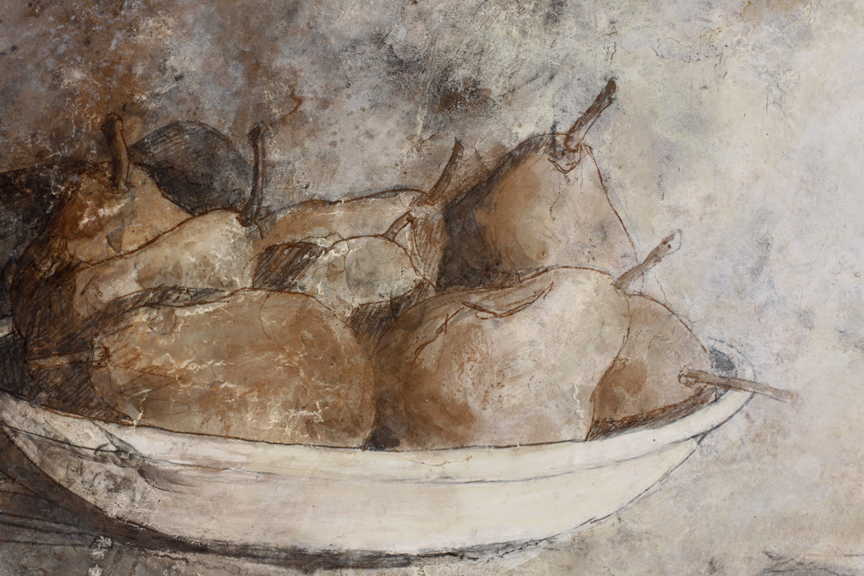 Le sable du temps (Ehon), 2013, détail Encaustique, fusain et clous antiques sur livre monté sur panneau 17” x 28.5” / 43 x 72 cm