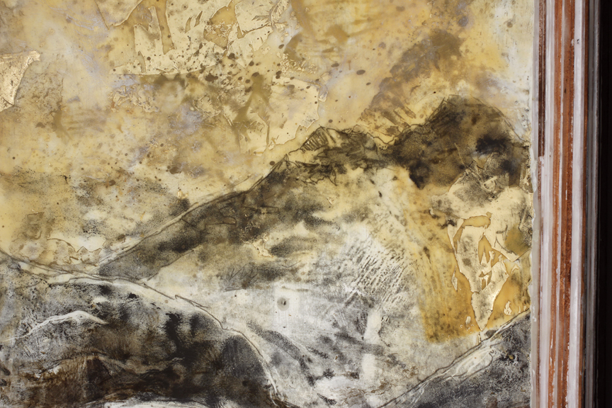Réservoir de mémoire, 2016, détail Encaustique et feuille d’or sur livre monté sur panneau 17” x 28.5” / 43 x 72 cm