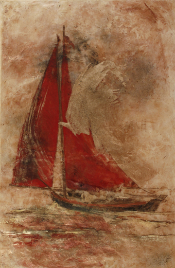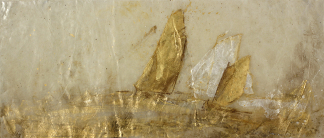Masino nous donne à voir un monde concret ( fruits, arbres et paysages, livres, voiliers et objets de toutes sortes ) mais aussi, il nous fait ressentir ses gestes calés en des matières légères ou pesantes, par des traits fins ou par de larges coups de pinceau, et à partir de ces «images» du réel, de toutes ces techniques artistiques, surviennent, disparaissent, se transforment sous la surface évidente du tableau, des silhouettes, des ombres mouvantes, bouillonnantes et, si ces silhouettes, ces ombres troublantes existent bel et bien, si celles-ci bougent, si elles viennent à nous, c’est qu’elles obéissent à une autre présence que celle du seul regard du spectateur, elles vivent par la lumière changeante à souhait, par le déplacement subtil de la luminosité et l’imperceptible vibration du spectateur lui-même car sa rétine est bouleversée, elle vibre intensément. Ces ombres, comme les anges et leurs mystères, vivent, viennent, s’en vont, reviennent par la danse de la lumière sur l’encaustique et les glacis, les transparences, par ses divers empâtements travaillés par la gestuelle réfléchie du peintre (peindre à l’encaustique exige de penser vite et de constamment songer aux gestes posées sur la toile), vivent, viennent, s’en vont, reviennent par le corps entier des spectateurs; ces derniers, corps et lumière, corps dans la lumière, agitations intérieures des êtres qui regardent, recréent ces présences au moyen des transparences proposées par Masino. Spectateurs et lumière détruisent, réinventent continuellement, indéfiniment différentes aussi, ces figures fantomatiques; je pense, ici à Tabla luna (page 9) ou à Le souffle de la mer (page 92-93).